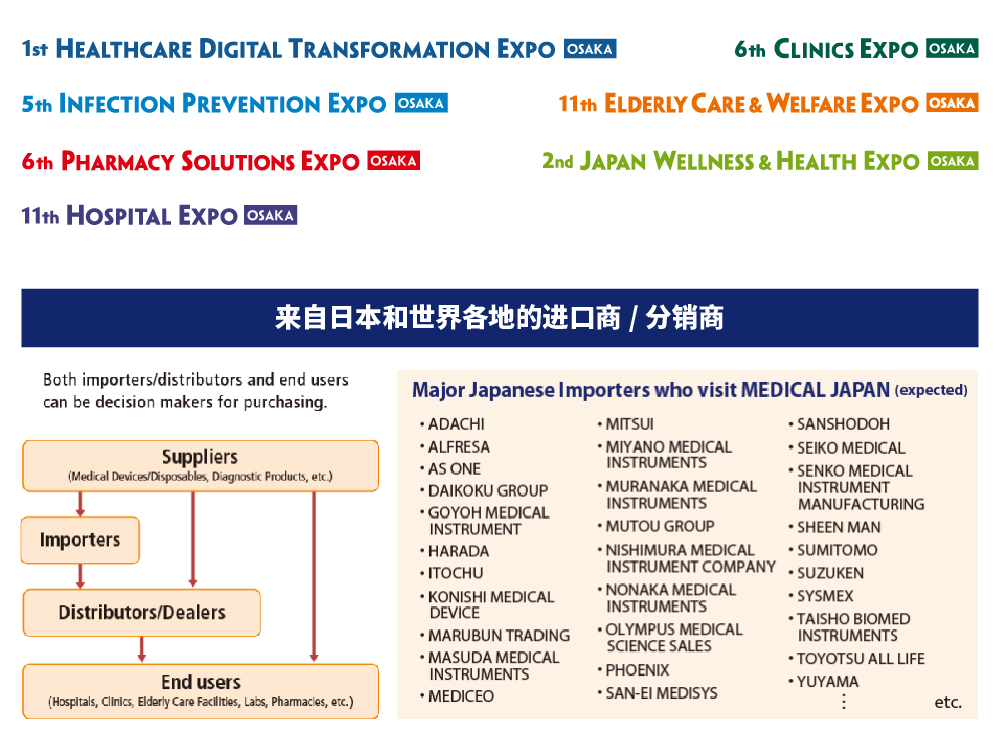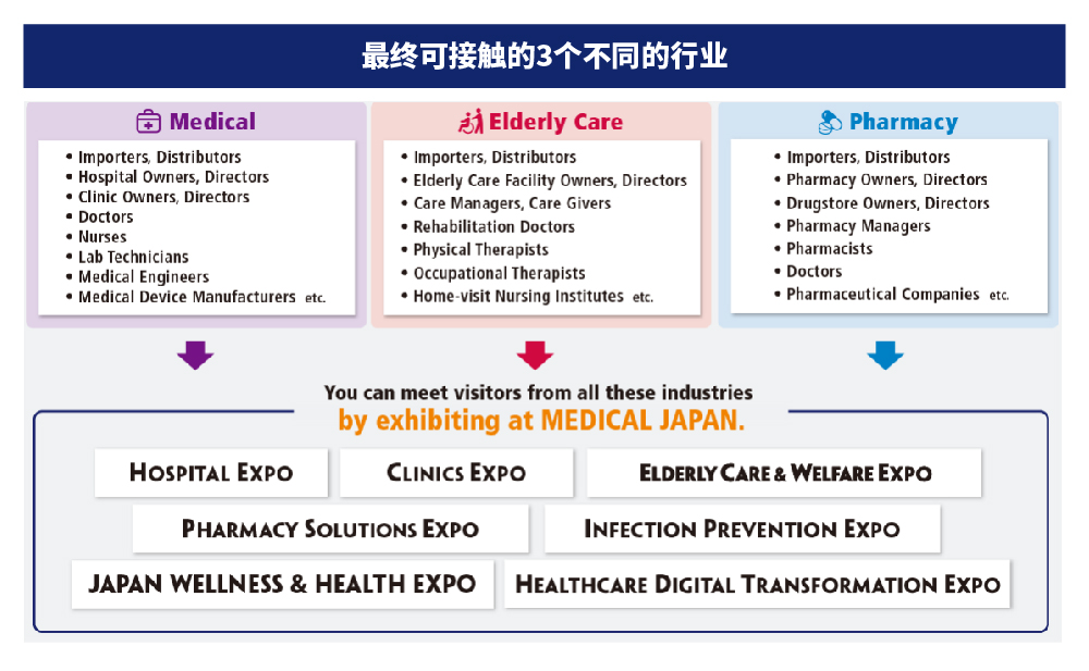 MEDICALJAPAN 是您与来自世界各地与会者会面的绝佳平台(例如进口商/分销商、终端用户、国际客商等),它由7个专业展会组成,是日本唯一的综合性医疗展会。